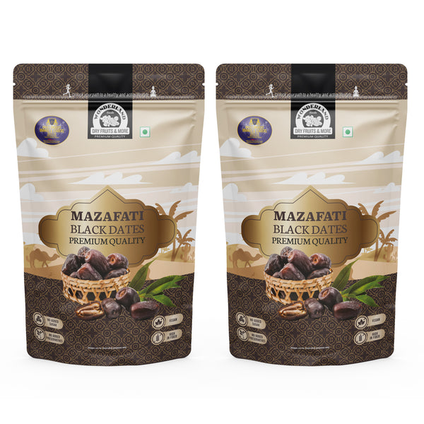 • Mazafati dates in general, are high in various nutrients and contain many different types of vitamins and minerals. The nutritional value of Black dates is impressive. Regular consumption of Mazafati dates helps boost energy levels, reinforce nerves, take care of anaemia, enhance memory and awareness.